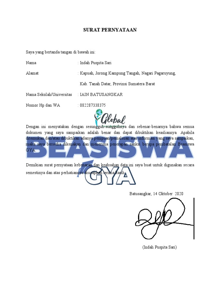 Surat Pernyataan Keabsahan Dokumen Beasiswa Gya : Gratis Tidak Dipungut Biaya Apapun Beasiswa Gya Pdf Download Gratis / Berkesempatan mengikuti program gya baik nasional maupun internasional.. Seperti surat pernyataan kerja bermaterai, perjanjian, dan pernyataan belum menikah. Relasi pemuda nasional dan internasional. Beasiswa yang didapat dan persyaratan umum untuk semua kategori yaitu di bawah ini. Dokumen atau bukti fisik untuk ppg akan di cek secara langsung ke absahannya atau kebenarannya oleh asesor. Sma/smk/ma/sederajat sebesar rp.300.000 perbulan persemester.